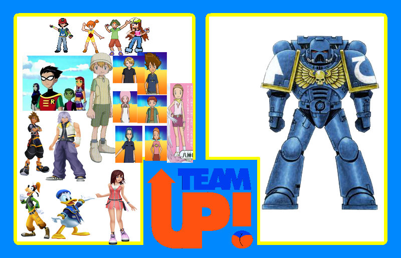 this is a team up between Sora, Riku, Kairi, Donald, and Goofy (Kingdom Hearts); Ash, Misty, Tracey, and Melody (Pokemon); Taichi, Yamato, Sora, Mimi, Koshiro, Joe, Takeru, and Hikari (Digimon); and Robin, Starfire, Beast Boy, and Raven (Teen Titans) with Space Marine from Warhammer 40k where to be fair, Ash, Misty, Tracey, Melody, and 8 Original Digidestined are powered up than their canon selves to ensure that they’re can fights alongside Sora and Company as well Teen Titans in at least near-equal grounds when they’re teams up with Spess Mehreens