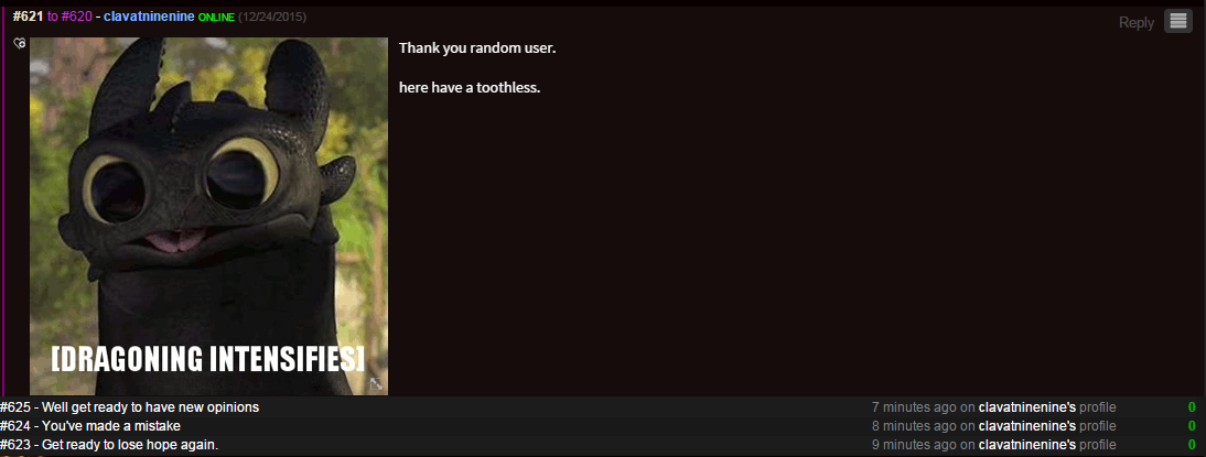 Meaning that between your post from 12/14, there was only 1 post made of your profile before my reply /user/clavatninenine/623 which was MY comment you deleted.