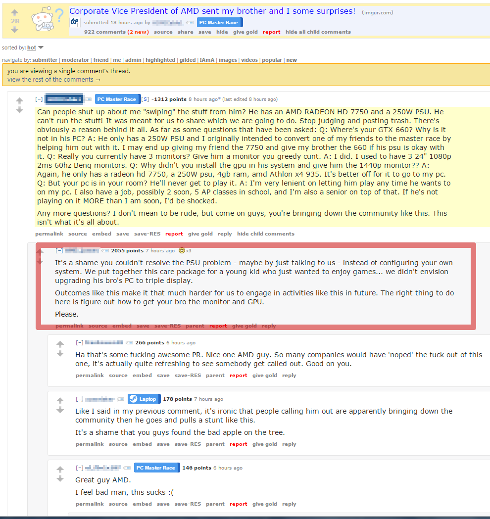 Backstory: Reddit faggot claimed his brother had autism to /r/pcmasterrace (subreddit for pc enthusiasts) and got several free parts from AMD. When it came to light that he eventually used all of the parts for himself and not the 'autistic brother,' AMD themselves called him out.