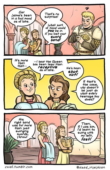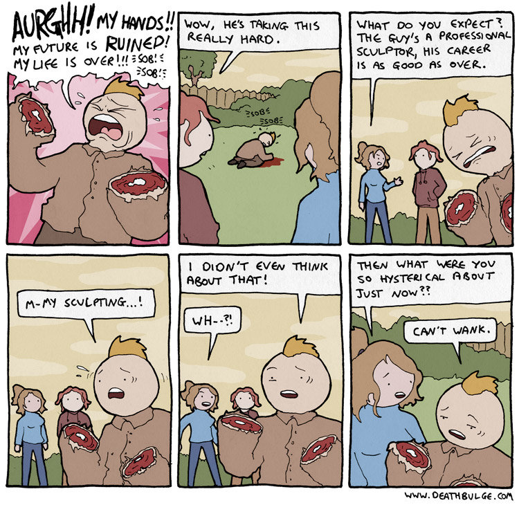 It really isn't funny, it's just stating the obvious. The first thought of 90% of men who see that he had his right hand cut off would be, man will he have a hard time masturbating.
