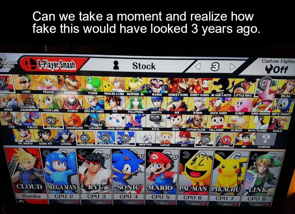Smash is old as hell, them adding new characters isn't a surprise at all. Allowing 8 players instead of 4 isn't a huge thing either. Consoles have been increasing the number of players since they've been around.