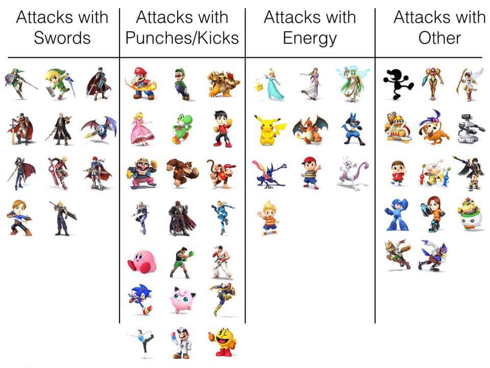This is all my opinion, I'm no hardcore smasher, just someone who plays with my friends. But to me, even though there are the least amount of them they feel like one model of sword character was copied 11 times and a few tweaks were made (Except for metaknight)