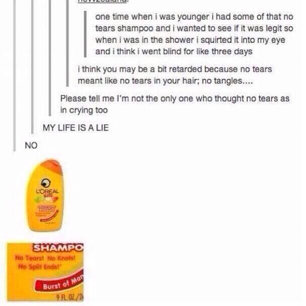 When Johnson and Johnson came out with "no more tears" they meant that it wouldn't make a kid's hair dry and unmanageable, causing it to tear when it was brushed