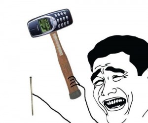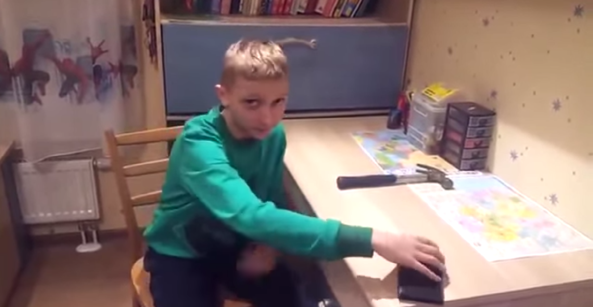 misses the phone on the second hit. comes down on his knee brings the hammer back up in recoil then buries the claw into his face