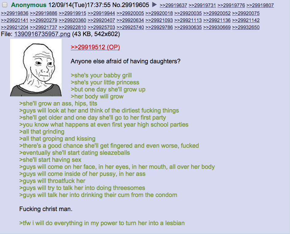 I dunno, as a father I'm far more comfortable with her being a lesbian than some little douchebag getting his penis near her, again, because, I know how young guys think