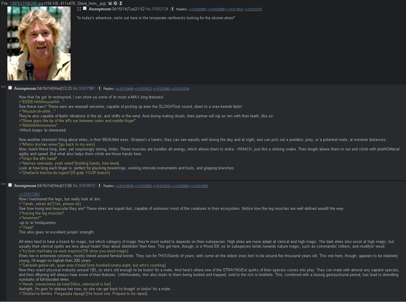 Now another interestin' thing about elves, is their Beautiful eves. Sharpers a hawks, they can see equally well during the day and at night, and can pick out a predator, prey, er a potential mate, at extreme distances.