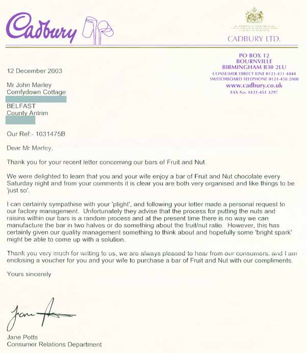 For reference I've found this picture of a letter someone claims to have received from Cadbury's, can't say for sure whether it's legit - but this looks far more like a real corporate letter