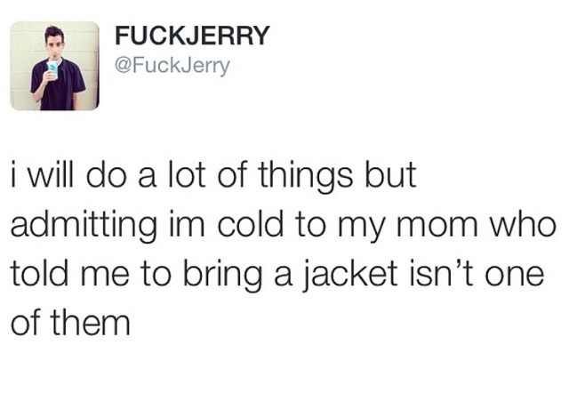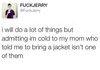 Lets be honest, most of us who dont' bring a jacket WANT to get cold. I'm a guy, you know how often i get cold? Lets put it this way, i lived in new york, i dressed in thong sandles, shorts, and a t-shirt. The heaviest jacket i wore during -30 degree weather was a hoodie. I was still ******* hot. Then again, i made a chair/igloo in the snow, so maybe thats part of it but still I love the cold
