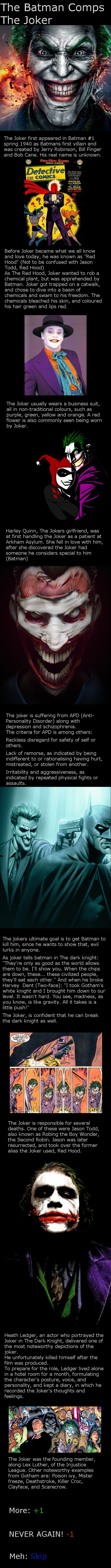There are many origin stories for him, but none are concrete. The most accepted theory, if any, is that he was a comedian named Jack Naper who was forced by some mob to steal from ACE Chemicals wearing the Red Hood suit that was worn alternatingly within the mob. He went insane after the acid bath that distorted him and made his wife disgusted with him.