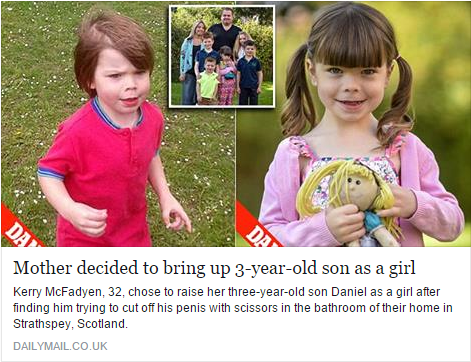Again, I'm skeptical that the first part actually happened. As if a three year old can hold a coherent conversation about slicing off his own body parts in order to change gender.