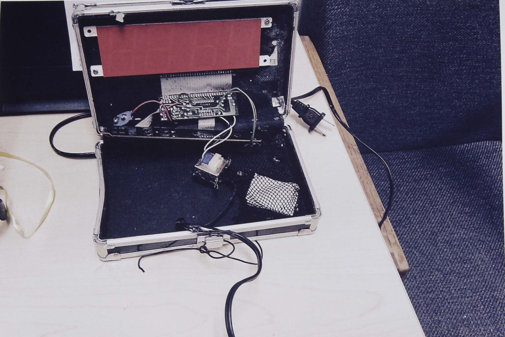 Now, you'll note from the photograph of it that it has a power cord and no back up battery attached. So one must conclude that he deliberately plugged it in. He would have also deliberately had to set the alarm to make it go off while in class.