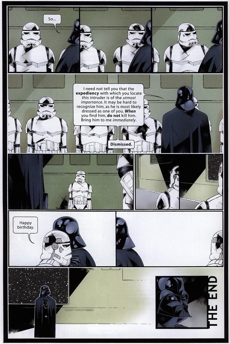 IIRC in the comic the troopers are talking about what an ass vader is and wonder why he's such a dick. That one learns that it's his birthday that day and saw him being somewhat sad and alone (again, IIRC) and so wishes him a happy birthday.
