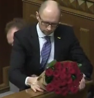 Moustache guy Oleh Barna had been collecting signatures for a draft resolution of no confidence in the government. This would result in the resignation of the current prime minister Arseniy Yatsenyuk Receiver of flowers who has been losing support recently due to his governments new economic measures. He previously stated that he "Wouldn't cling to his chair." And would resign if there was a successful 'no confidence' vote.
