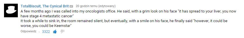 I'm pretty sure TB is the only YouTuber who heard his cancer got worsened and is still savage enough to joke about his own health. He is probably feeling worse about it than he shows to the outside world, but it still take a pair of Big Brittanica Balls to make other people laugh instead of letting them feel sorry for you. God i love that guy. If the cancer keels him over it'll be like a close family member died.