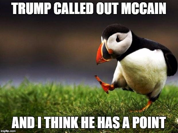 John McCain has been using the War Hero thing as a crutch for years and is no good as a politician. He is glorified for something that HUNDREDS of pilots went through during Vietnam, but the only reason he got popular was because his father was a well known Navy admiral. On top of that he only flew 16 missions. I personally know a legitimate war hero and his family that never got any recognition at all. McCain sucks as a leader and has abused the his status as hero for actions that hundreds of others did and never got any notice. Trump was the only one to notice this and call him out.Here is a link to a real war hero that I can gladly say was a friend of my family for many years: en.wikipedia.org/wiki/Michael_J._Novosel