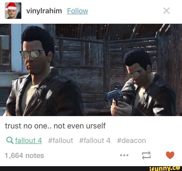 trust nobody Flag candywolf (See more...) prev next random - Fav Favorite Comment ✖ PrevTop NextComment everybody is in love with deacon but i myself prefer hancock's bad boy charm sorry for not cropping the **** out if this i am too lazy prev next Tags: Fallout | deacon Follow OTIS” HOT EVEN ' i notes ... +90 Views: 7961 Favorited: 1 Submitted: 01/06/2016 Share On Facebook -Favorite +Favorite Unsub from candywolf Subscribe to candywolf