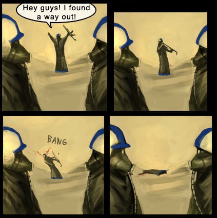 Oh man I never looked closely enough at this one to see that he shot himself. I thought the joke was that he actually did find a way out and was then killed by a sniper before he could tell anyone. Yikes. That's a whole lot darker than I thought it was.