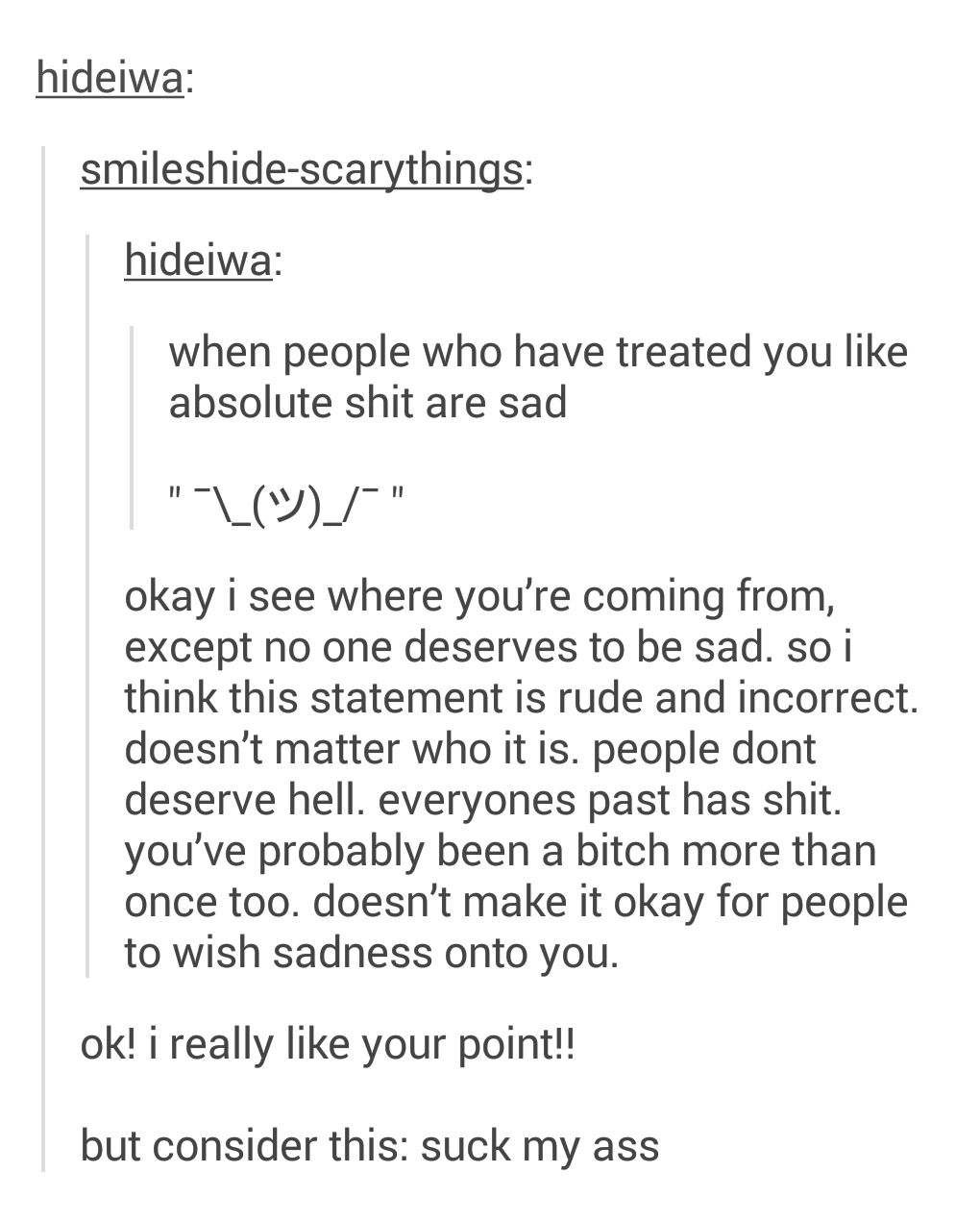 It's poetic justice for all those people who try to be nice, act friendly and whatnot, and still get **** because someone, somewhere, wants them to have a bad day for no other reason than spite.