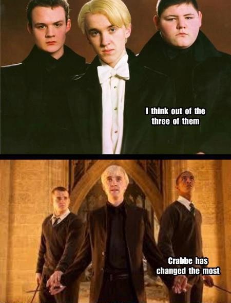 well, crabbe was taken out of the movies becourse he was pulled over by the police or something with pot. Dont remember the name of that black guy, but he was one of draco manboys friends in the books.
