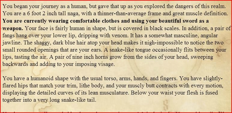 You are a 6 foot 2 inch tall naga, with a frame and great muscle definition.