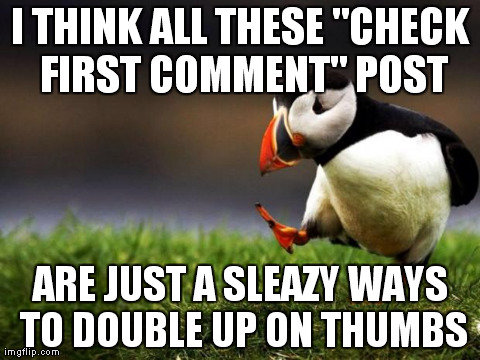 uncreative title Flag iced (See more...) next random - Fav Favorite Comment ✖ Top NextComment i just think you could have the same affect just by putting some space in the content to force scroll down instead of thumb whoring next Tags: puffin | jews I THINK All THESE "( FIRST " POST ARE JUST ll WINS UP THUMBS‘ ... +44 Views: 4663 Favorited: 0 Submitted: 05/01/2014 Share On Facebook -Favorite +Favorite Unsub from iced Subscribe to iced