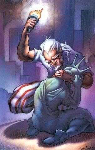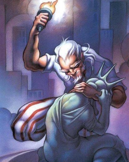 I still see him as a gritty, upholding, and wall of a man; old and kicking, but this picture is what I always thought of him. He cares about his homeland, and seeing as how they gave us Lady Liberty, I see him comforting an adopted child as her home is hurting.