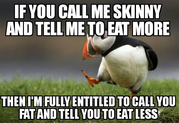 Therefore, someone skinny-ass has no entitlement to call a healthy person "fat" because the healthy person is a twat about pointing out the obvious.