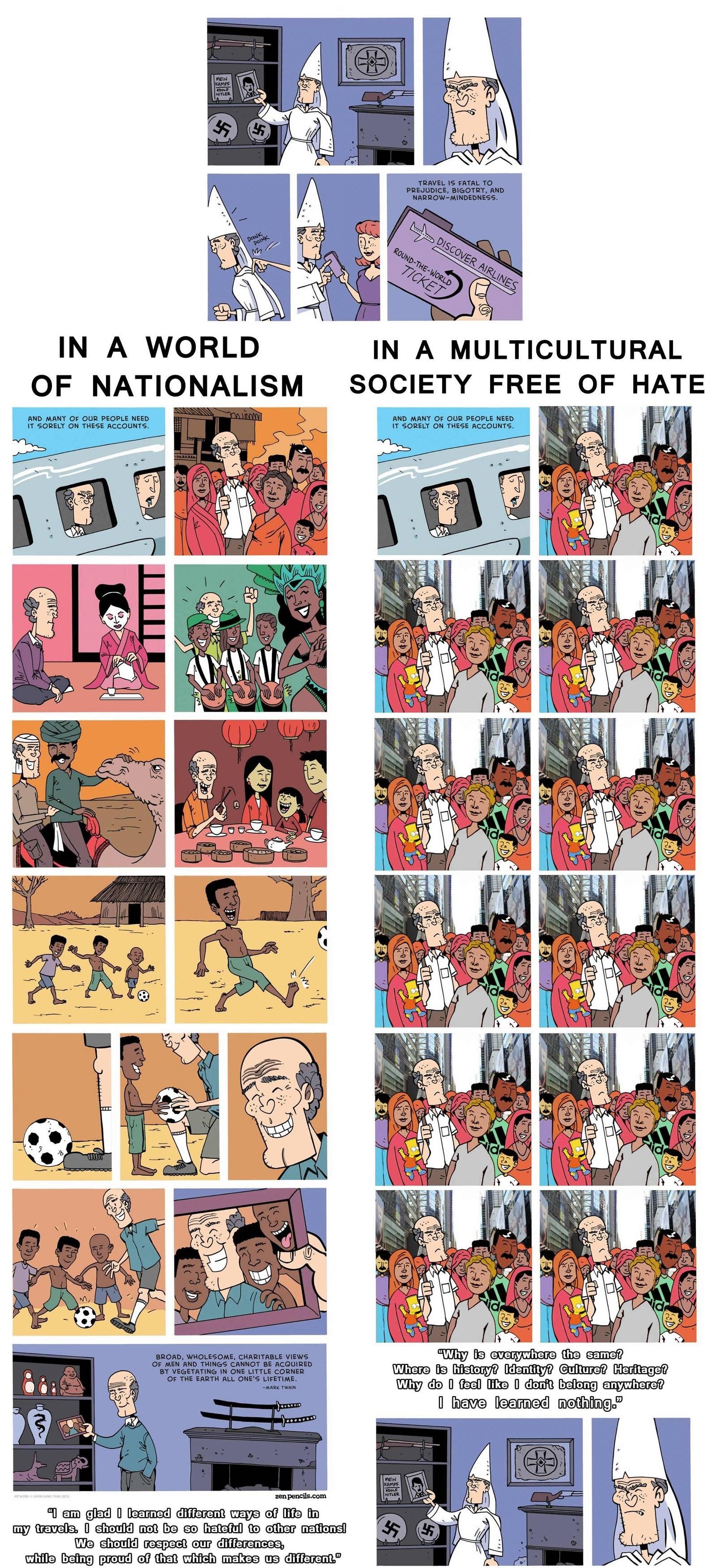 I agree on all the "mondialisation and capitalism are killing unique cultures and depraving people of their identitiy" but this cartoons just opposes tollerance and nationalism saying the former is the best.