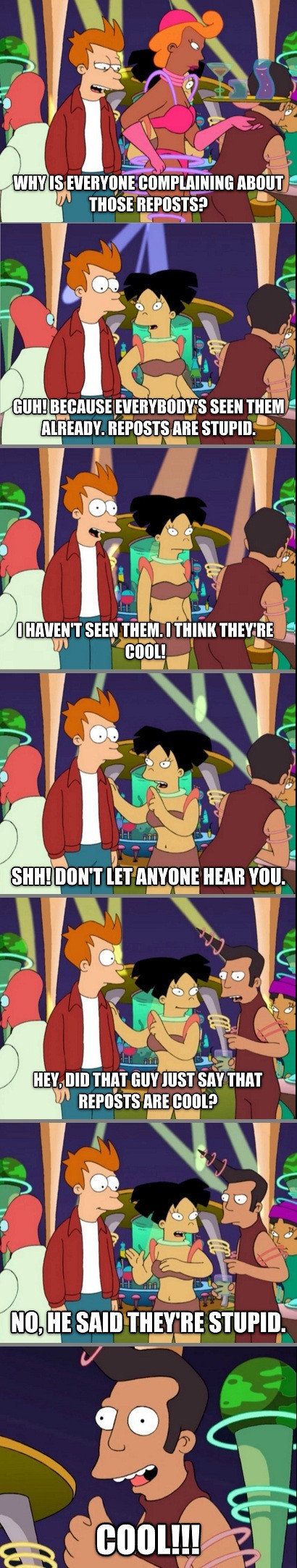 Let me rephrase that. Nobody cares like you do. To some people, it is not a repost, and they are grateful to see it, like me. Other people still find it funny, and do not care that it's a repost.