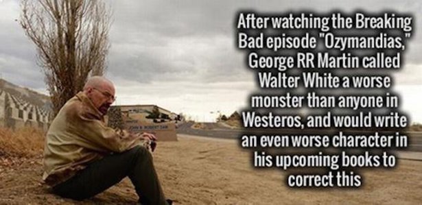 He did say this, and it's total ******** . Walt only started selling meth to provide for his family after he died, though later he began to enjoy the power trips it gave him, and became increasingly violent and erratic. Really, the worst things Walt was responsible for was murders committed out of necessity. He also offered $80 million to Jack to spare Hank's life. He was a monster by the end, but not even close to the worst in Westeros. Ramsey hunts innocent women with his dogs, then rapes and flays them to death. He forced his second wife to have sex with his dog. His first wife he forcibly married, then locked her in a room to starve to death while she ate her own fingers. His mind games with Theon, and the flaying/castration combination is amongst the most horrific **** shown on TV. But I guess it's not TV, it's HBO. That doesn't even include the Mountain, who raped and murdered Princess Elia with the blood of her infant son still on his hands, who killed a man for snoring, who fed living people to bears, who shoved his brother's face into a fire for playing with one of his toys, and who cut off a man's limbs and forced him to eat them. Westeros has some ****** up people. Walt is certainly a more developed and relatable monster, but not a worse monster.