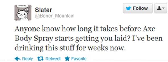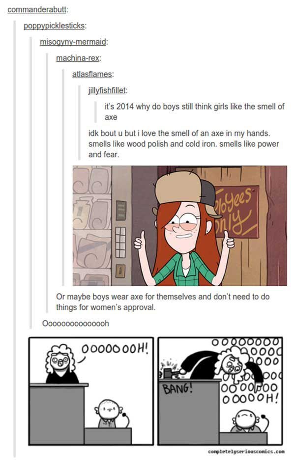 Yeah exactly. i don't know what the ******** is all about. personally i like the 2012 edition or chocolate one. i've got a natural body odor, which doesn't smell that bad, BUT it eliminates or ***** up the scent of normal parfum. but axe for some reason helps me with that and so it makes me feel confident. confident enough to take on alot of women at the same time. i guess that's what the commercials are all about. or maybe it's just a metaphor of how women prefer men with axes i unno