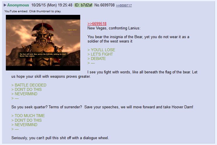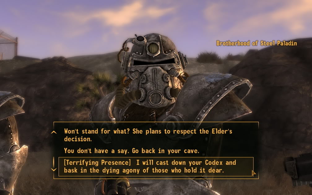 I for one adore Fallout 4's new power armor system and voiced protagonist. More than 4 talk options would be great, but I definitely prefer voiced to silent. Unless that voice is Nolan North. A lengthy game like this where you're Nolan North would not be played by me