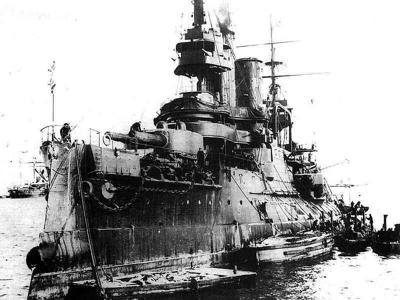 Russian battleship Retvizan, whose captain received severe wounds in the ship's brave solo charge against the Japanese fleet in the Battle of the Yellow Sea