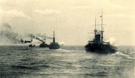 Artist illustration of a Japanese battleship attacking a Russian battleship.
