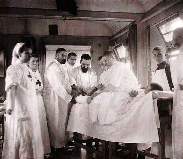 Russian surgery on a train to a wounded troop.