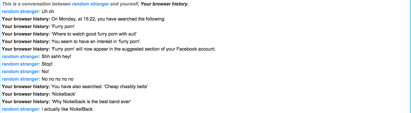 This is a conversation between random stranger and yourself, Your browser history.