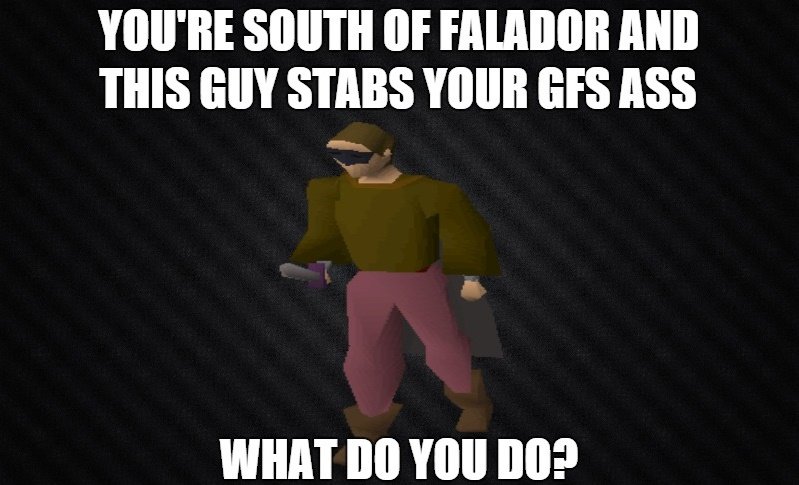 What do you do? Flag sparkylizard (See more...) next random - Fav Favorite Comment ✖ Top NextComment (Enlarge) You're south of falador and this guy stabs your gf's ass What do you do? next Tags: funny | runescape | poonscape | gf | Video Games | games | gaming IIE (ltr AND THIS SIN STAB YOUR SIS ASS WHAT BO "Ill III]? ... +21 Views: 2617 Favorited: 1 Submitted: 12/14/2015 Share On Facebook -Favorite +Favorite Unsub from sparkylizard Subscribe to sparkylizard