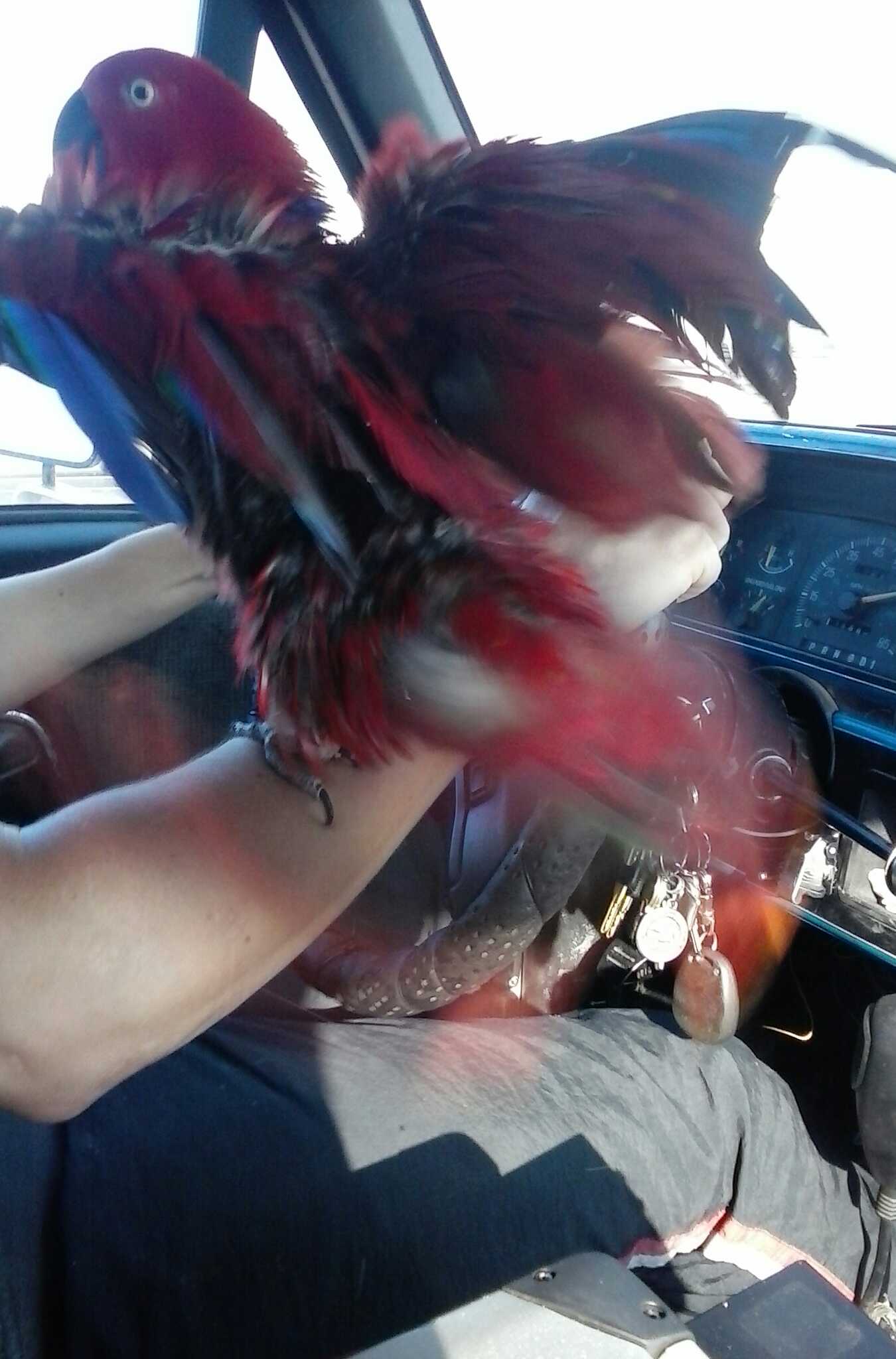 i am the driver, i take her everywhere including camping and fishing as well as shopping, what you see is her pretending to fly as i go down the road, irony is she's flight trained and hates flying, breed is eclectus parrot.
