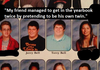 I have a friend who did a similar thing. He did the picture and then went back on make-up picture day wearing the same shirt but purposely spelled his last name slightly wrong on the form so that he would have two different pictures surrounding his brother.