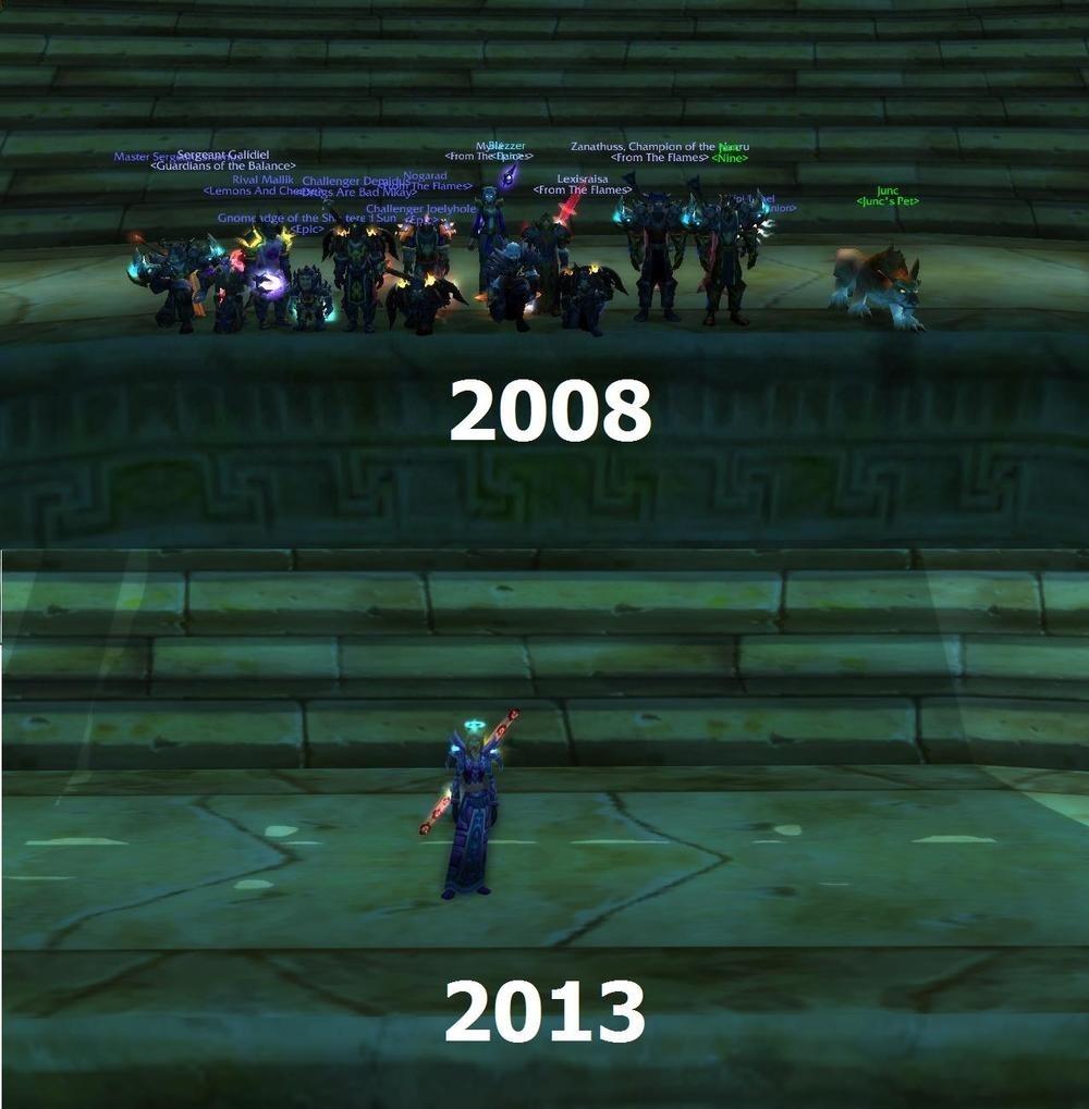 I hear you. I had this guild that I ran with for a couple years. I loved everyone in that guild, we were all good friends. Then one by one, we all stopped playing, I was somewhere around the middle, as I stopped for the sake of focusing on real life. I just re-subscribed about a week ago, after almost 2 and a half years on not playing, I went back in and first thing I did was look at what my guild had become, it was still there but I didnt recognize a single name on the roster. Sad times.