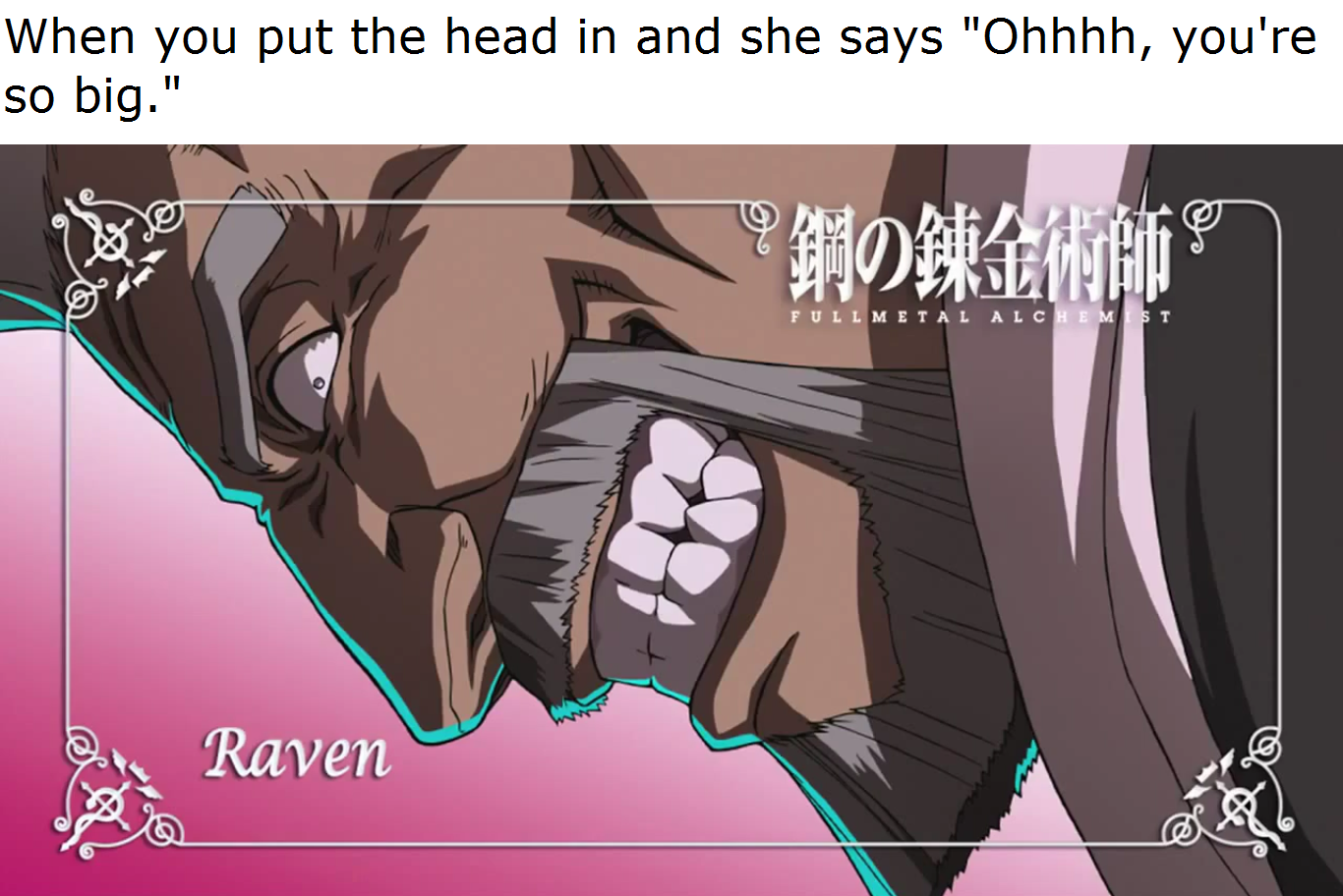 When you put the head in Flag ogthegreat (See more...) next random - Fav Favorite Comment ✖ Top NextComment (Enlarge) next Tags: ogthegreat | anime memes | Fullmetal Alchem | sex +41 Views: 5263 Favorited: 2 Submitted: 12/12/2015 Share On Facebook -Favorite +Favorite Unsub from ogthegreat Subscribe to ogthegreat