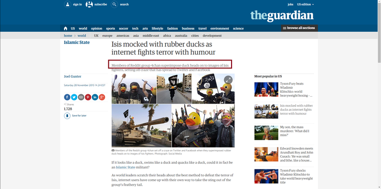 Members of Reddit group khan sup crimp ose duck heads on to images of Isis