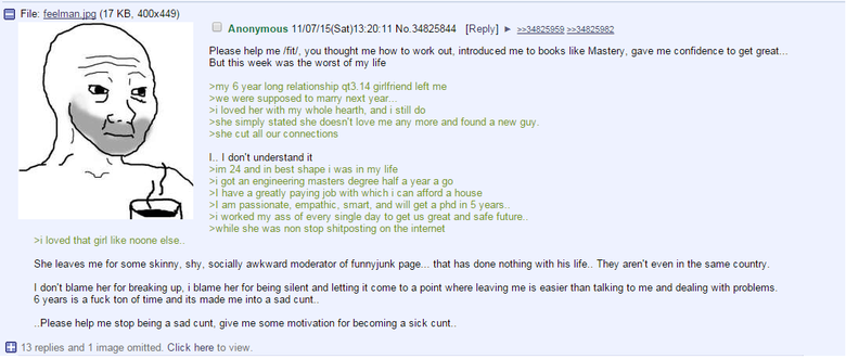 She leaves me for some skinny, shy, socially awkward moderator of funnyjunk page- that has done nothing with his life.. They aren' t even in the same country.