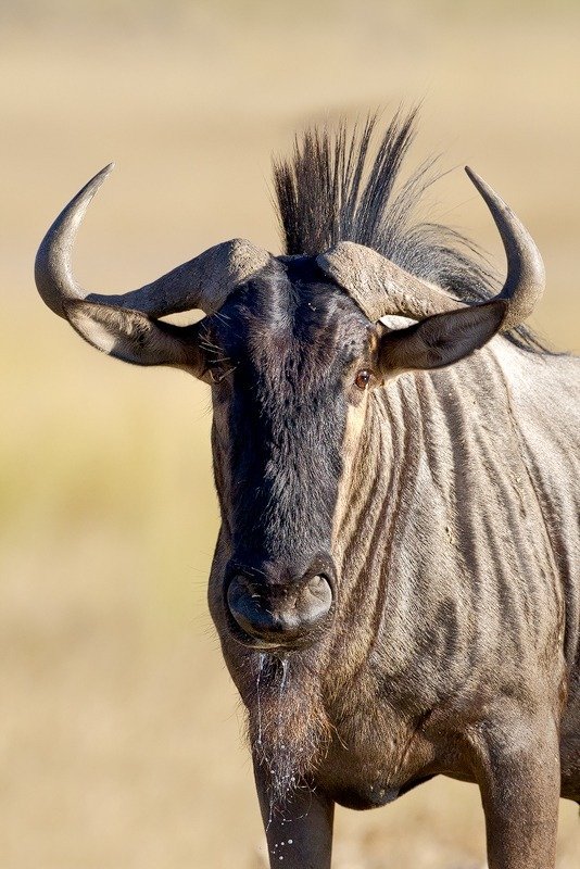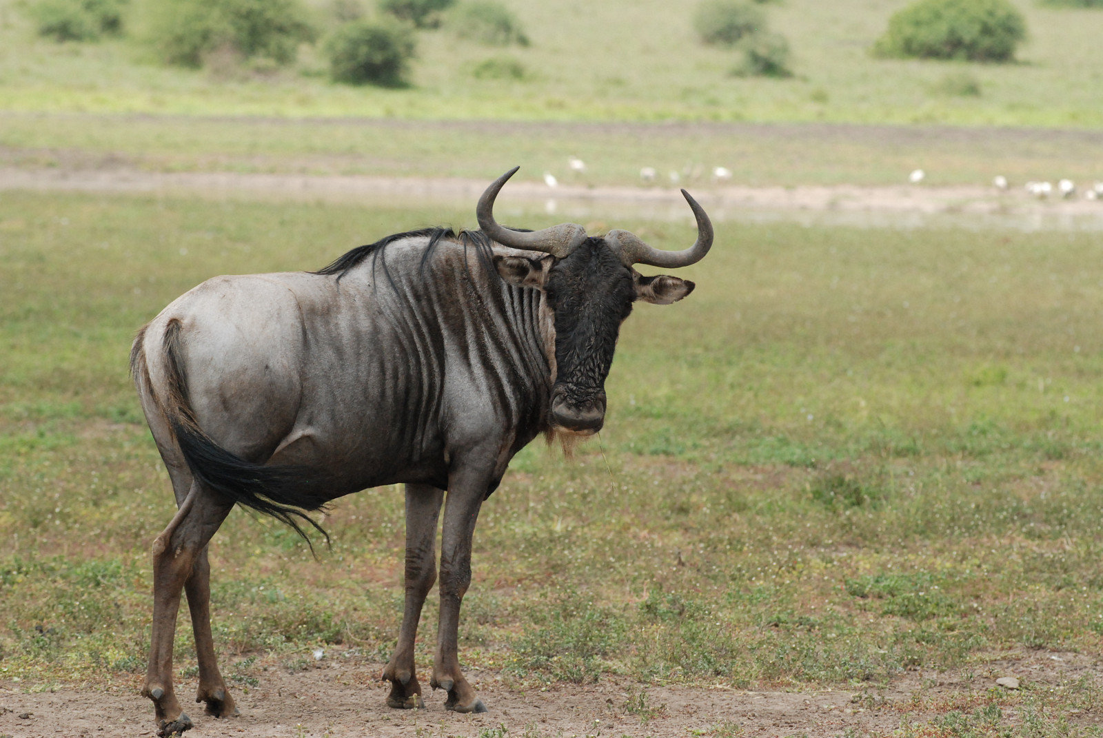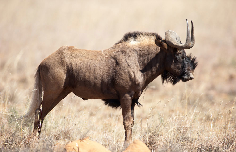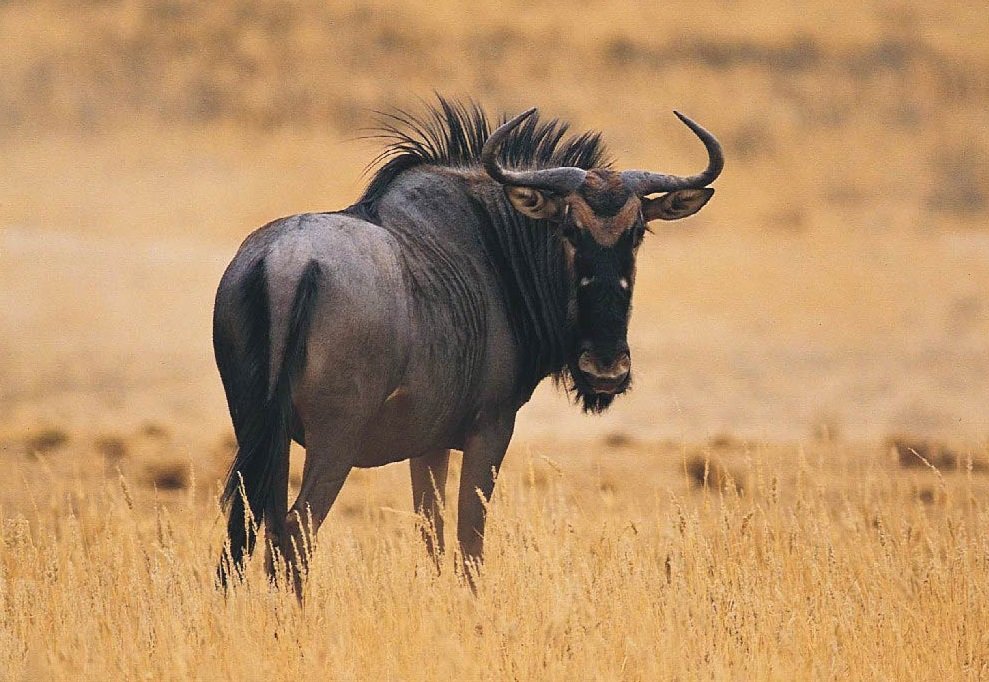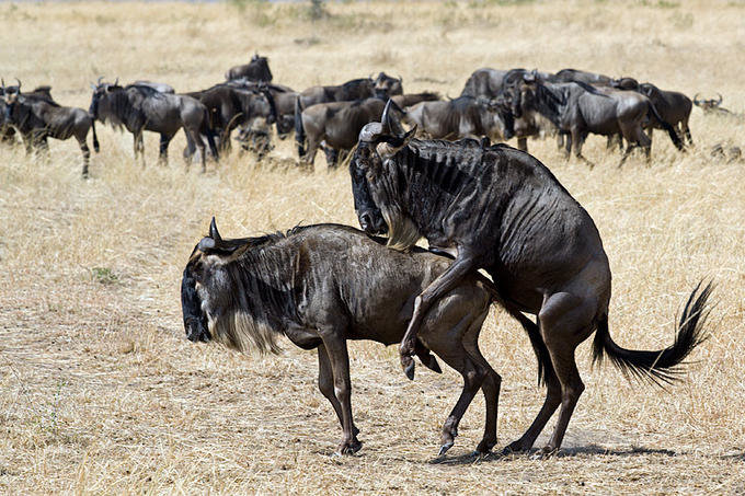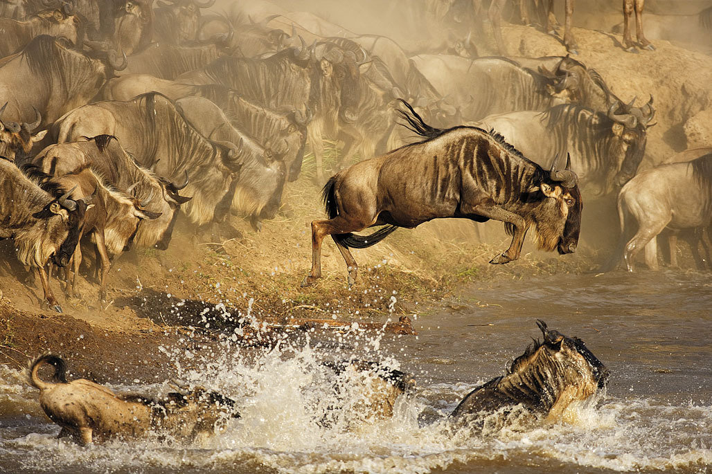 Wildebeest females give birth to a single calf in the middle of the herd, not seeking a secluded place, as do many antelopes. Amazingly, about 80 percent of the females calve within the same 2 to 3 week period, creating a glut for predators and thus enabling more calves to survive the crucial first few weeks. A calf can stand and run within minutes of birth. It immediately begins to follow its mother and stays close to her to avoid getting lost or killed by waiting predators. Within days, it can run fast enough to keep up with the adult herd.