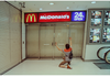 The content shows the 1st floor corridor area of a mall. the mall has white flooring and white walls. there in an escalator on the right, almost out of view of the picture. Abive this escalator is advertisments for what appears to be food.The main focus of the content is a closed McDonald's franchise and a man.
