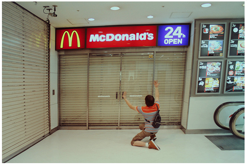 The man is looking at the McDonald's, With his arms gesturing high above his head, he is kneeling on his left leg, while is right leg is in front of him, knee bent. The pose makes it look like he has found such disappointment that he questions his beliefs in all that be believes in. The anguish and desperation can he seen. unlike his face.