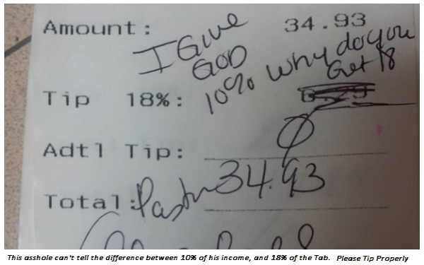 Hi This is a scam on the workers/ waiters that all restaurants pull. They don't have to pay waiters minimum wage because of Tips, then if the waiter gets cheap customers he's screwed, so they started to include Tips no the customers bill. It's a real racket on the waiters and the customers by the restaurant industry as a whole. Please don't blame anyone else for this "system" but the restaurant itself. Thank You for participating