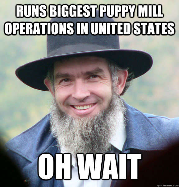 They are some of the worst scum of the earth when it comes to animal treatment. They view the dogs as lower than livestock, strictly money makers. I'm not a PETA supporter either, quite the opposite. But there are several large amish puppymills around where I'm at and the local pet supply store I work at does a lot of stuff with local rescues as well. I've seen first hand what some of these dogs look and act like when they've just been pulled from their **** holes. Dogs matted up with urine and feces so thick it takes an hour just to shave them down to give them a bath. Birth defects and illnesses. Just last week they got a couple golden retrievers in so introverted from abuse and lack of socialization all they wanted to do was sit in their kennels, stare at the floor behind them and pretend that there weren't human beings in the room with them. If the rescues won't take the ones they don't have any use for then they will kill them.
