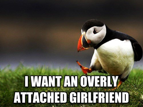 NO... You ******* don't... An overly attached girlfriend is like a ghost, everything you say, do and even think (She will find the **** out... Let me tell you) Will be brought into question if she disagrees or somehow warps it in her ******* mind into being about ANYONE but her..