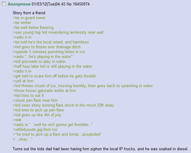 Turns out the kids dad had been having him siphon the local IF’ trucks, and he was soaked in diesel.